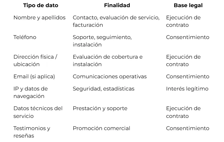 Al proporcionarnos sus datos personales a través de nuestros formularios de contacto, solicitudes de servicio, canales digitales (incluyendo WhatsApp), llamadas telefónicas o cualquier medio habilitado por 4NET, LLC, usted consiente de manera informada que dicha información sea recopilada y utilizada exclusivamente para los fines específicos para los cuales fue solicitada, tales como evaluar cobertura, brindarle información, gestionar la instalación, prestar el servicio contratado o darle soporte técnico.